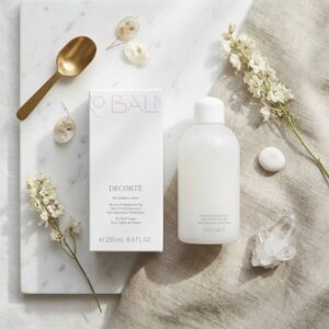 キールズの美容液と一緒に使っている化粧水は、コスメデコルテの薬用マイクロバームローション。肌をやわらかく整えてくれるので、その後の美容液の入りが変わります。
